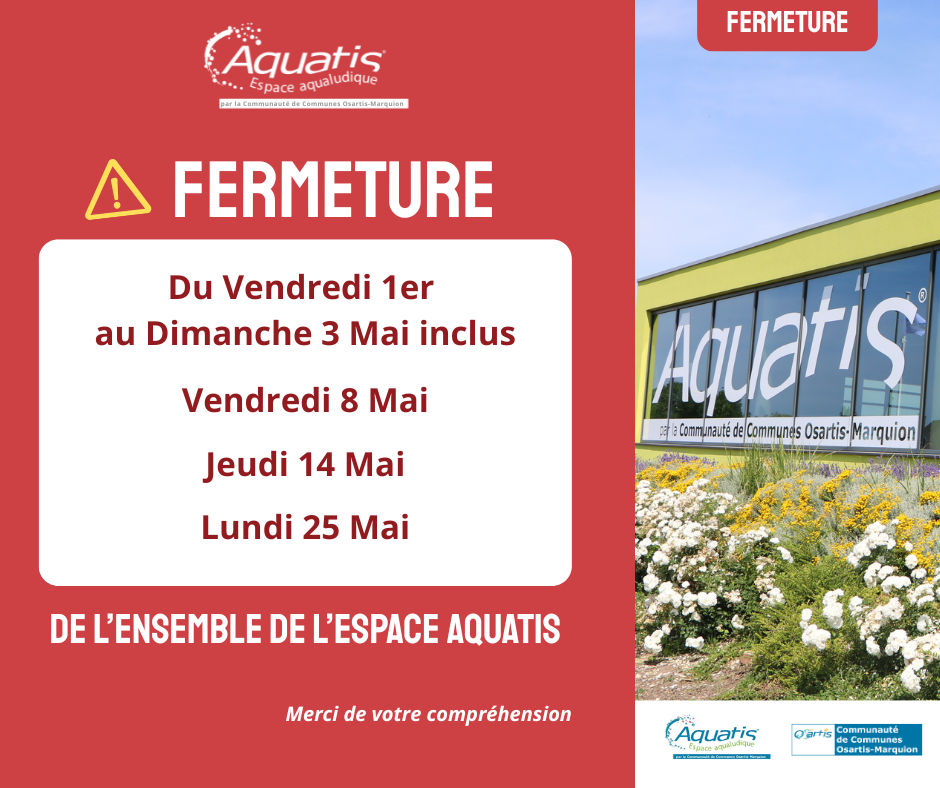 En raison de jours fériés et de l’organisation d’une compétition de natation, l’ensemble de l’espace Aquatis sera exceptionnellement fermé les 1er, 2, 3, 8, 14 et 25 mai 2026.